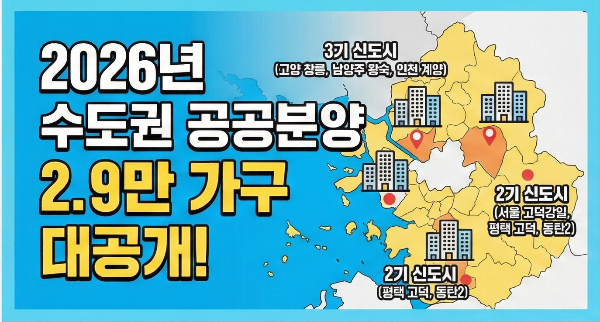 2026년 수도권 공공분양에서 2만 9천 가구가 쏟아집니다. 3기 신도시(고양 창릉·남양주 왕숙·인천 계양)부터 서울 고덕강일 3블록, 평택 고덕·동탄2 등 2기 신도시까지 주요 청약 포인트를 한 번에 정리했습니다. 나눔형·선택형 차이, 청년·신혼부부를 위한 특별공급, 비규제지역 추첨제 공략법, 청약 전 필수 체크리스트까지 2026 청약 필승 전략을 가장 쉽게 설명해 드립니다.